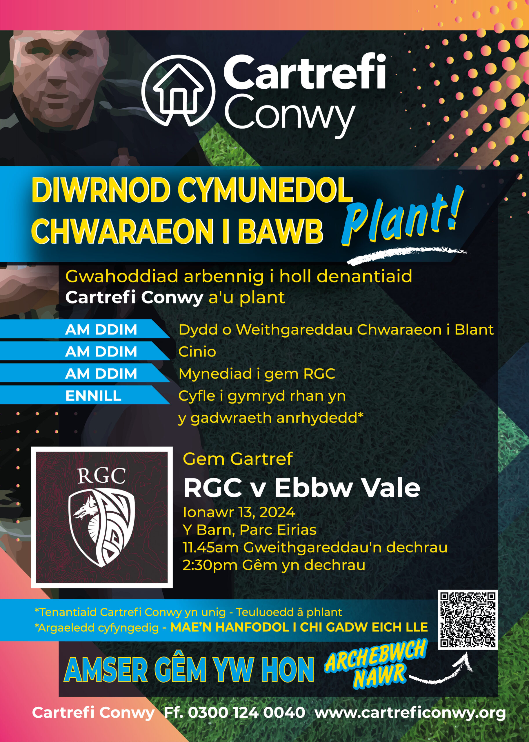 Join us for the Cartrefi Conwy Community Day: Sports For All! Including entry to the RGC V Ebbw Vale game on Saturday 13th January at The Barn, Eirias Park.